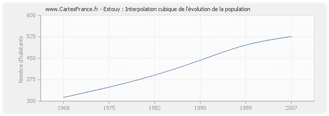 Cette courbe reprend l'historique de la population d'Estouy de 1968 à 2007 en interpolation cubique. Ceci permet d'obtenir plus précisément la population de la commune d'Estouy les années ou aucun recensement n'a été effectué.
