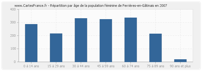 Répartition de la population féminine de Ferrières-en-Gâtinais par âge en 2007 :