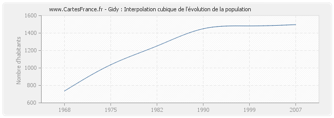 Cette courbe reprend l'historique de la population de Gidy de 1968 à 2007 en interpolation cubique. Ceci permet d'obtenir plus précisément la population de la commune de Gidy les années ou aucun recensement n'a été effectué.