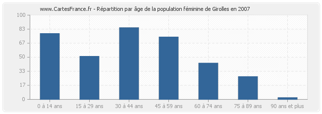 Répartition de la population féminine de Girolles par âge en 2007 :