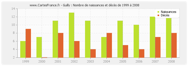 Guilly : évolution des naissances et décès de 1968 à 2007