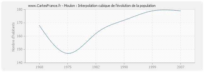 Cette courbe reprend l'historique de la population de Moulon de 1968 à 2007 en interpolation cubique. Ceci permet d'obtenir plus précisément la population de la commune de Moulon les années ou aucun recensement n'a été effectué.