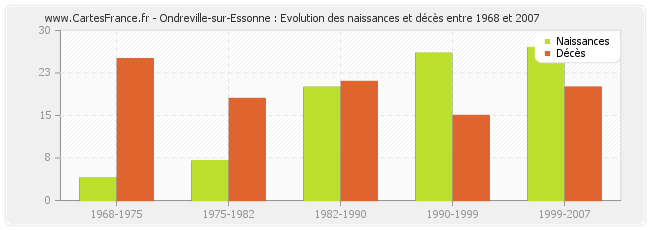 Ondreville-sur-Essonne : évolution des naissances et décès de 1968 à 2007