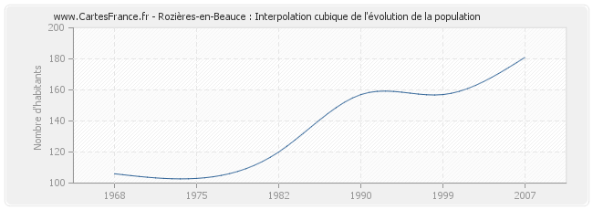 Cette courbe reprend l'historique de la population de Rozières-en-Beauce de 1968 à 2007 en interpolation cubique. Ceci permet d'obtenir plus précisément la population de la commune de Rozières-en-Beauce les années ou aucun recensement n'a été effectué.