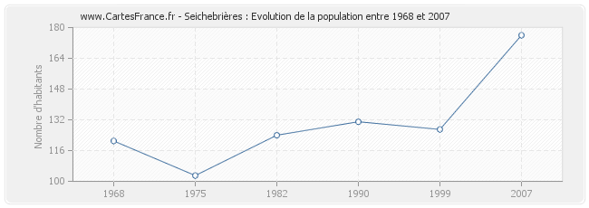 La population de Seichebrières était de 176 habitants en 2007, 127 habitants en 1999, 131 habitants en 1990, 124 habitants en 1982, 103 habitants en 1975 et 121 habitants en 1968.