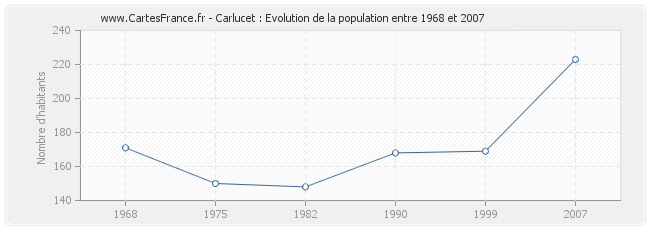 La population de Carlucet était de 223 habitants en 2007, 169 habitants en 1999, 168 habitants en 1990, 148 habitants en 1982, 150 habitants en 1975 et 171 habitants en 1968.