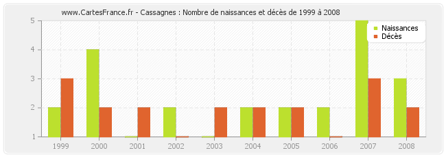- Cassagnes en 2008 : 3 naissances et 2 décès