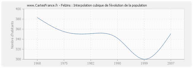 Cette courbe reprend l'historique de la population de Felzins de 1968 à 2007 en interpolation cubique. Ceci permet d'obtenir plus précisément la population de la commune de Felzins les années ou aucun recensement n'a été effectué.