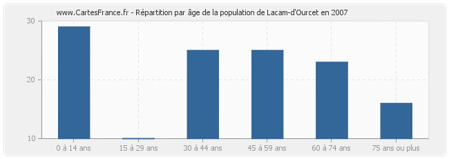 - Population de Lacam-d'Ourcet de 30 à 44 ans : 25 habitants