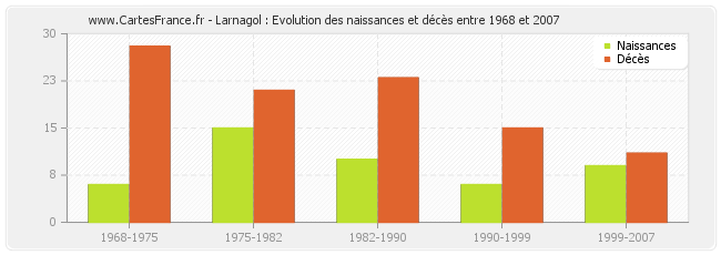 Larnagol : évolution des naissances et décès de 1968 à 2007