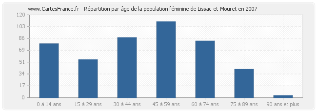 Répartition de la population féminine de Lissac-et-Mouret par âge en 2007 :