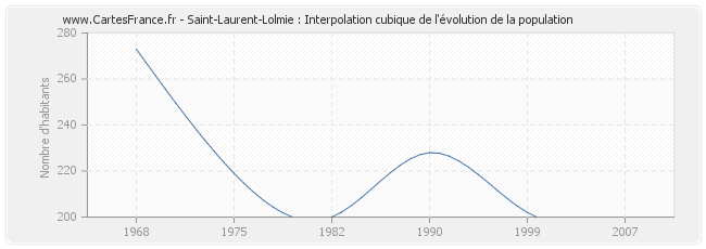 Cette courbe reprend l'historique de la population de Saint-Laurent-Lolmie de 1968 à 2007 en interpolation cubique. Ceci permet d'obtenir plus précisément la population de la commune de Saint-Laurent-Lolmie les années ou aucun recensement n'a été effectué.