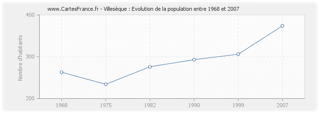 La population de Villesèque était de 374 habitants en 2007, 306 habitants en 1999, 293 habitants en 1990, 276 habitants en 1982, 234 habitants en 1975 et 263 habitants en 1968.