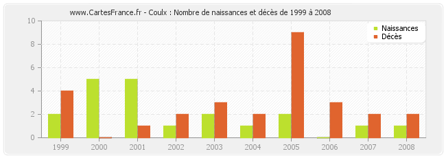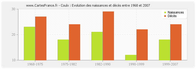 Coulx : évolution des naissances et décès de 1968 à 2007