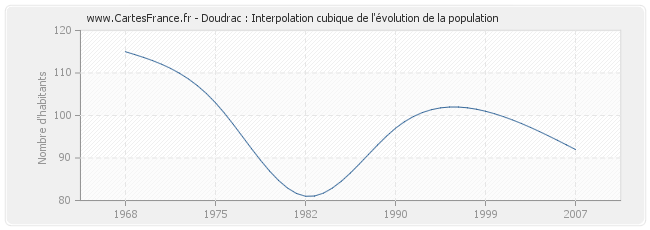 Cette courbe reprend l'historique de la population de Doudrac de 1968 à 2007 en interpolation cubique. Ceci permet d'obtenir plus précisément la population de la commune de Doudrac les années ou aucun recensement n'a été effectué.