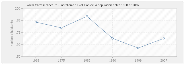 La population de Labretonie était de 169 habitants en 2007, 159 habitants en 1999, 169 habitants en 1990, 192 habitants en 1982, 180 habitants en 1975 et 186 habitants en 1968.