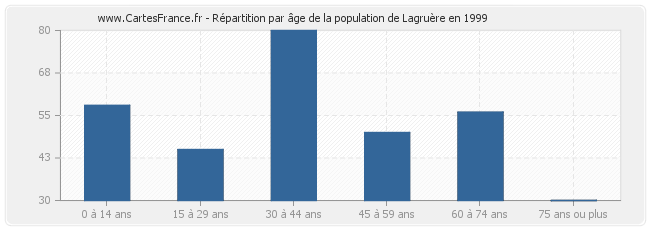 - Population de Lagruère de 30 à 44 ans : 80 habitants