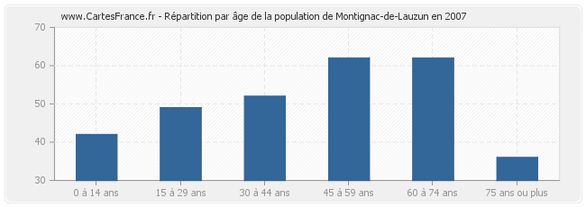 - Population de Montignac-de-Lauzun de 60 à 74 ans : 62 habitants