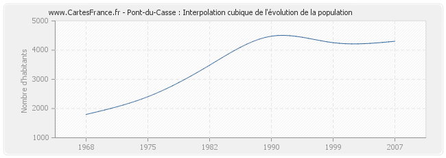 Cette courbe reprend l'historique de la population de Pont-du-Casse de 1968 à 2007 en interpolation cubique. Ceci permet d'obtenir plus précisément la population de la commune de Pont-du-Casse les années ou aucun recensement n'a été effectué.