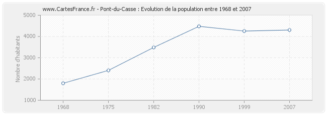 La population de Pont-du-Casse était de 4 305 habitants en 2007, 4 256 habitants en 1999, 4 479 habitants en 1990, 3 485 habitants en 1982, 2 405 habitants en 1975 et 1 798 habitants en 1968.
