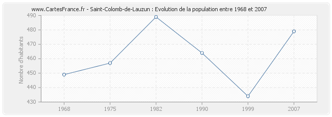 La population de Saint-Colomb-de-Lauzun était de 479 habitants en 2007, 434 habitants en 1999, 464 habitants en 1990, 489 habitants en 1982, 457 habitants en 1975 et 449 habitants en 1968.