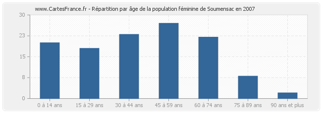 Répartition de la population féminine de Soumensac par âge en 2007 :