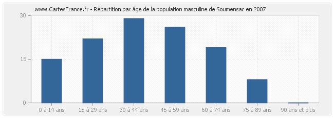 Répartition de la population masculine de Soumensac par âge en 2007 :