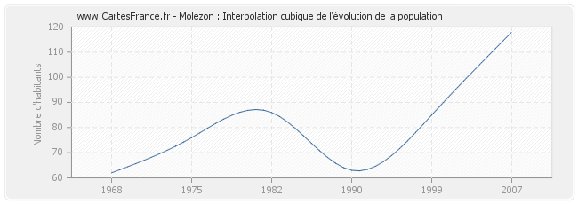 Cette courbe reprend l'historique de la population de Molezon de 1968 à 2007 en interpolation cubique. Ceci permet d'obtenir plus précisément la population de la commune de Molezon les années ou aucun recensement n'a été effectué.