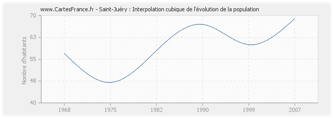 Cette courbe reprend l'historique de la population de Saint-Juéry de 1968 à 2007 en interpolation cubique. Ceci permet d'obtenir plus précisément la population de la commune de Saint-Juéry les années ou aucun recensement n'a été effectué.