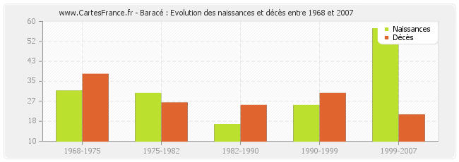 Baracé : évolution des naissances et décès de 1968 à 2007