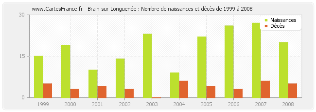 - Brain-sur-Longuenée en 2008 : 20 naissances et 5 décès