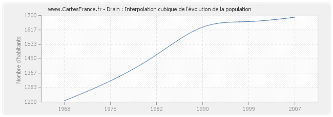 Cette courbe reprend l'historique de la population de Drain de 1968 à 2007 en interpolation cubique. Ceci permet d'obtenir plus précisément la population de la commune de Drain les années ou aucun recensement n'a été effectué.