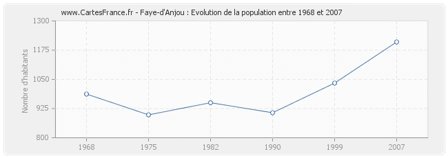 La population de Faye-d'Anjou était de 1 210 habitants en 2007, 1 034 habitants en 1999, 907 habitants en 1990, 950 habitants en 1982, 898 habitants en 1975 et 987 habitants en 1968.