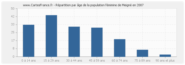 - Femmes de 15 à 29 ans habitant Meigné : 43