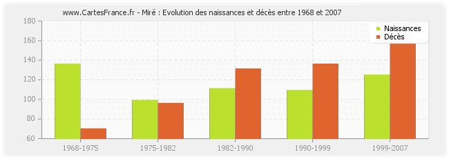 La population de Miré était de 978 habitants en 2007, 969 habitants en 1999, 958 habitants en 1990, 1 035 habitants en 1982, 961 habitants en 1975 et 741 habitants en 1968.