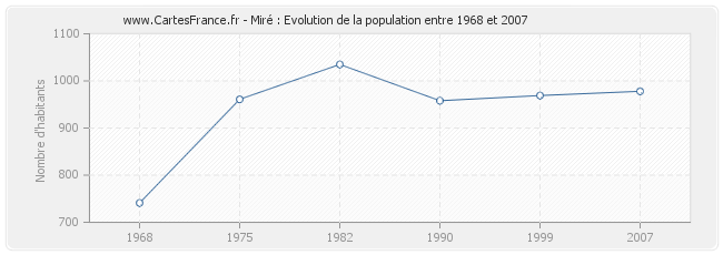 Cette courbe reprend l'historique de la population de Miré de 1968 à 2007 en interpolation cubique. Ceci permet d'obtenir plus précisément la population de la commune de Miré les années ou aucun recensement n'a été effectué.