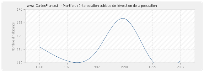 Cette courbe reprend l'historique de la population de Montfort de 1968 à 2007 en interpolation cubique. Ceci permet d'obtenir plus précisément la population de la commune de Montfort les années ou aucun recensement n'a été effectué.