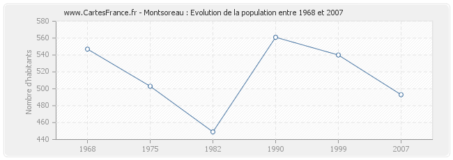 La population de Montsoreau était de 493 habitants en 2007, 540 habitants en 1999, 561 habitants en 1990, 449 habitants en 1982, 503 habitants en 1975 et 547 habitants en 1968.