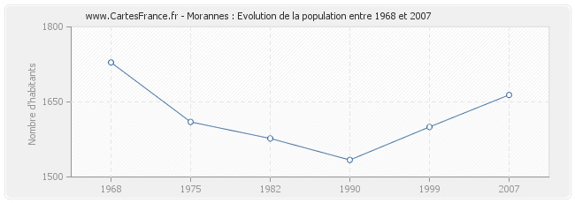 Cette courbe reprend l'historique de la population de Morannes de 1968 à 2007 en interpolation cubique. Ceci permet d'obtenir plus précisément la population de la commune de Morannes les années ou aucun recensement n'a été effectué.
