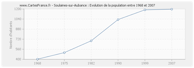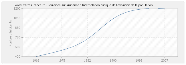 Cette courbe reprend l'historique de la population de Soulaines-sur-Aubance de 1968 à 2007 en interpolation cubique. Ceci permet d'obtenir plus précisément la population de la commune de Soulaines-sur-Aubance les années ou aucun recensement n'a été effectué.
