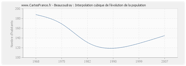 Cette courbe reprend l'historique de la population de Beaucoudray de 1968 à 2007 en interpolation cubique. Ceci permet d'obtenir plus précisément la population de la commune de Beaucoudray les années ou aucun recensement n'a été effectué.