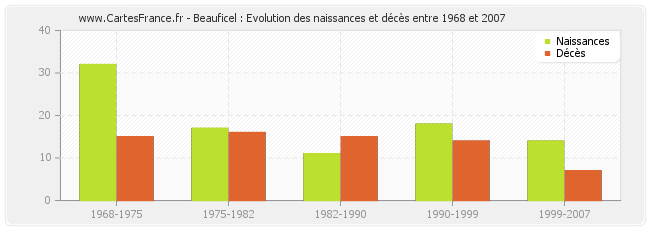 Beauficel : évolution des naissances et décès de 1968 à 2007