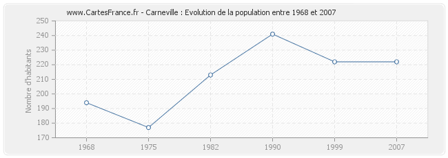 La population de Carneville était de 222 habitants en 2007, 222 habitants en 1999, 241 habitants en 1990, 213 habitants en 1982, 177 habitants en 1975 et 194 habitants en 1968.