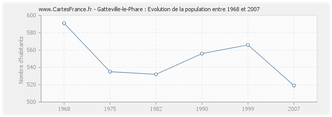 La population de Gatteville-le-Phare était de 519 habitants en 2007, 566 habitants en 1999, 556 habitants en 1990, 532 habitants en 1982, 535 habitants en 1975 et 591 habitants en 1968.