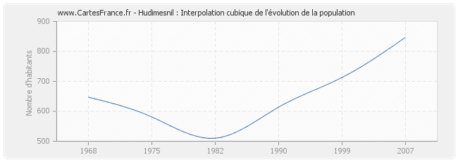 Cette courbe reprend l'historique de la population de Hudimesnil de 1968 à 2007 en interpolation cubique. Ceci permet d'obtenir plus précisément la population de la commune de Hudimesnil les années ou aucun recensement n'a été effectué.