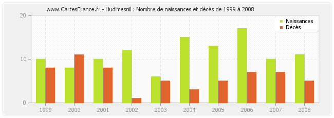 - Hudimesnil en 2008 : 11 naissances et 5 décès