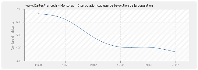 Cette courbe reprend l'historique de la population de Montbray de 1968 à 2007 en interpolation cubique. Ceci permet d'obtenir plus précisément la population de la commune de Montbray les années ou aucun recensement n'a été effectué.