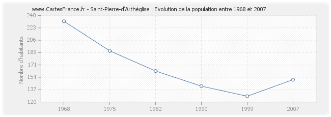 La population de Saint-Pierre-d'Arthéglise était de 151 habitants en 2007, 128 habitants en 1999, 142 habitants en 1990, 163 habitants en 1982, 191 habitants en 1975 et 232 habitants en 1968.