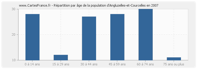 - Population d'Angluzelles-et-Courcelles de 60 à 74 ans : 30 habitants