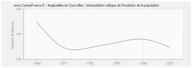 Cette courbe reprend l'historique de la population d'Angluzelles-et-Courcelles de 1968 à 2007 en interpolation cubique. Ceci permet d'obtenir plus précisément la population de la commune d'Angluzelles-et-Courcelles les années ou aucun recensement n'a été effectué.